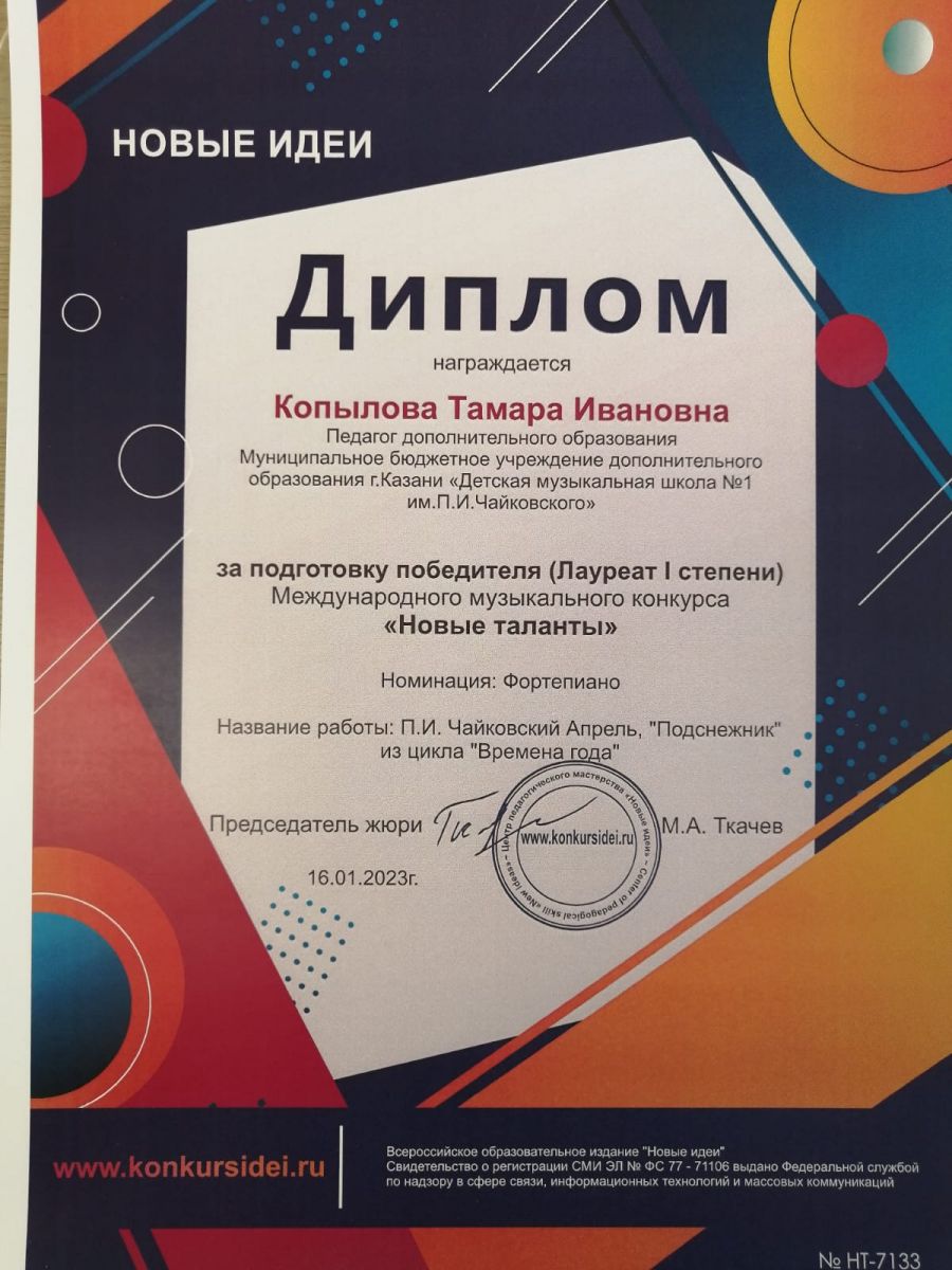 Всероссийский конкурс-фестиваль искусств "Новогоднее конфетти" - Благодарность Низамутдиновой Д.Ф.;