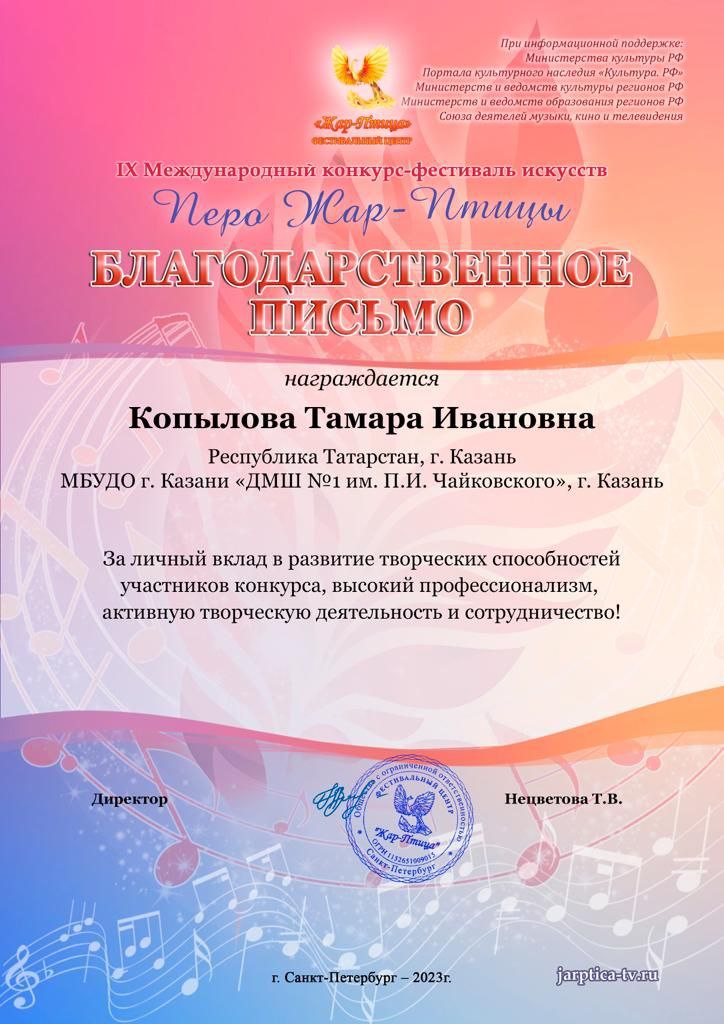 IX Международный конкурс-фестиваль искусств "Перо Жар-Птицы" - Благодарность Копыловой Т.И.;