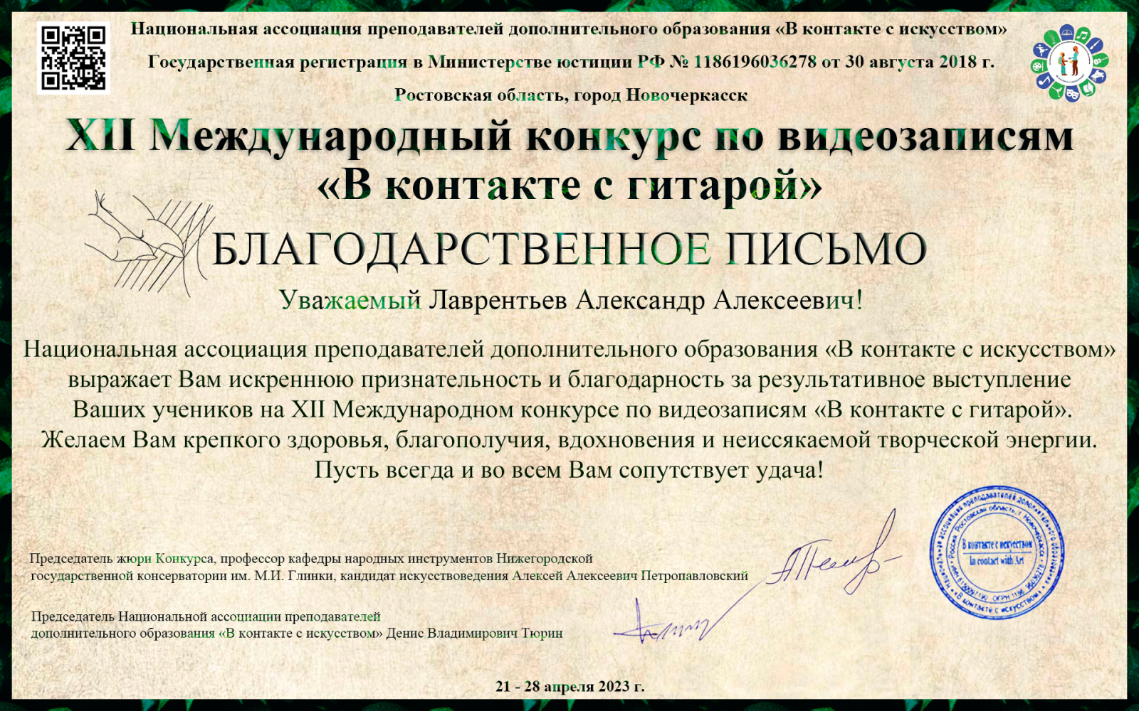 ХII Международный конку по видеозаписям "В контакте с гитарой" - Благодарность Лаврентьеву А.А.;