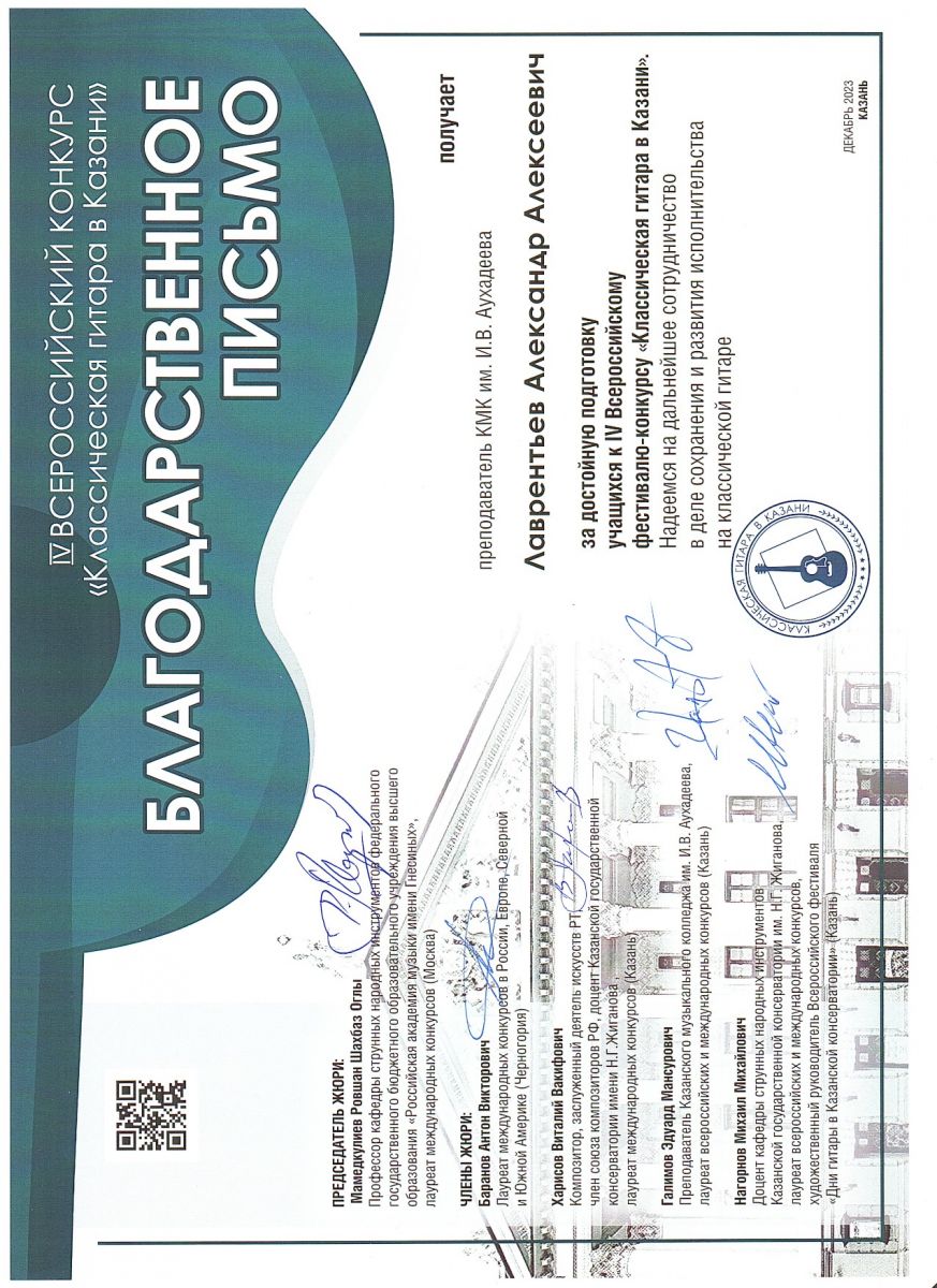 IV Всероссийский конкурс "Классическая гитара в Казани" - Благодарность Лаврентьеву А.А.;