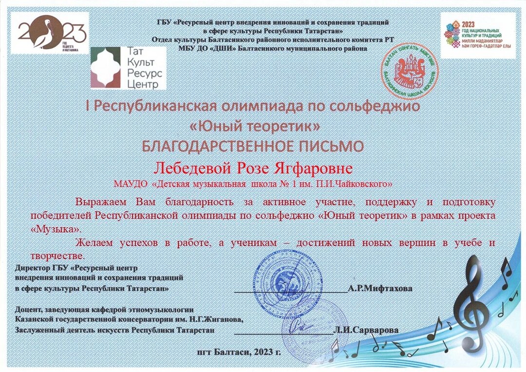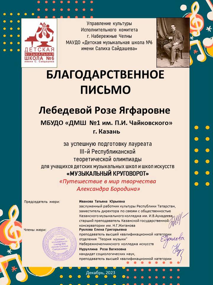 I Республиканская олимпиада по сольфеджио "Юный теоретик" - Благодарность Лебедевой Р.Я.;