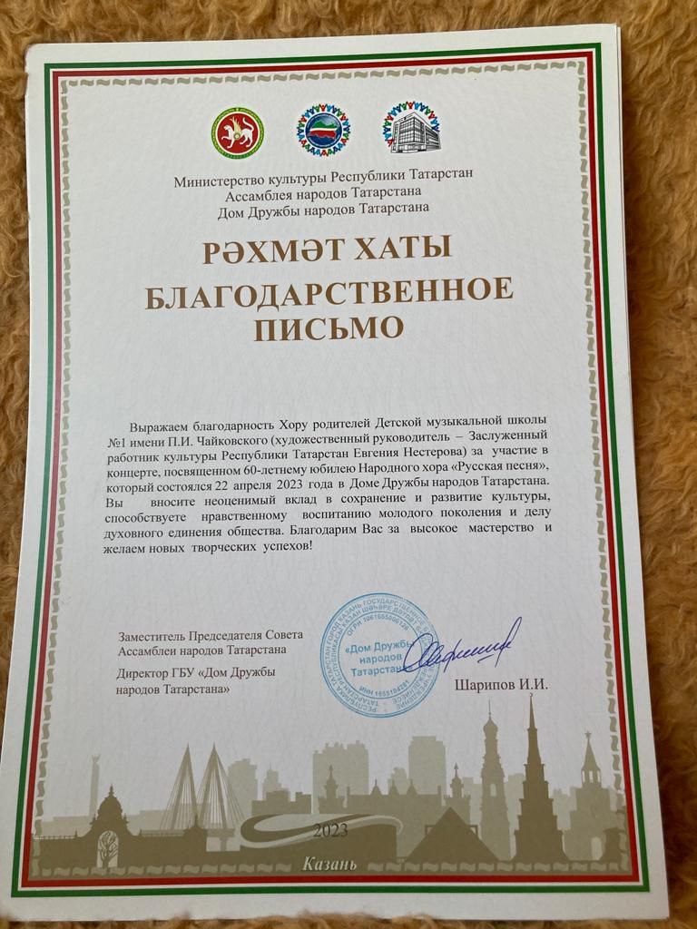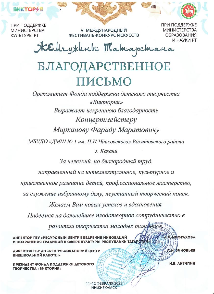 IV Международный фестиваль-конкурс искусств "Жемчужины Татарстана" - Благодарность Мирханову Ф.М.;