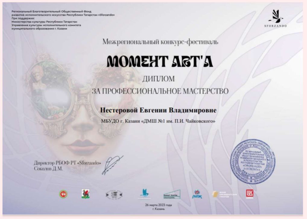 Международный конкурс пианистов "Моцарт XXI века" - Диплом за профессиональное мастерство Лаврентьевой А.И.;