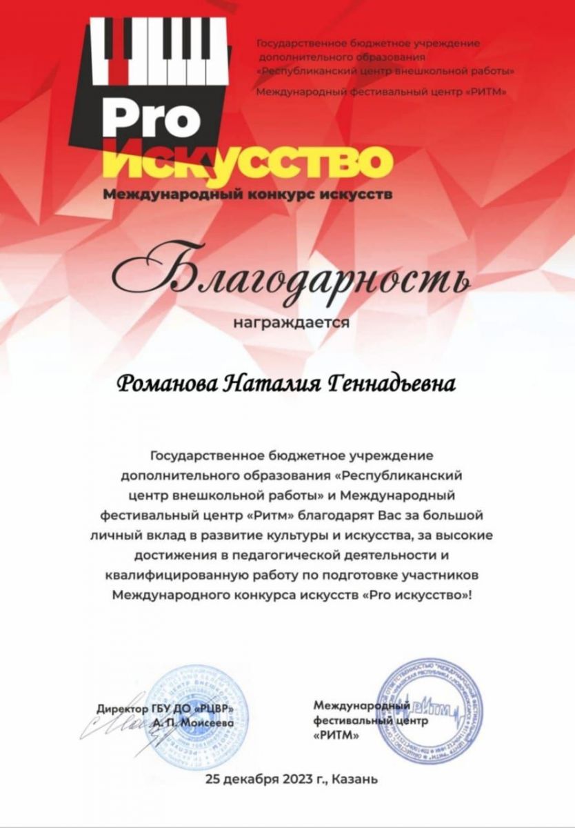 Международный конкурс "Pro Искусство" - Благодарность Романовой Н.Ю.;