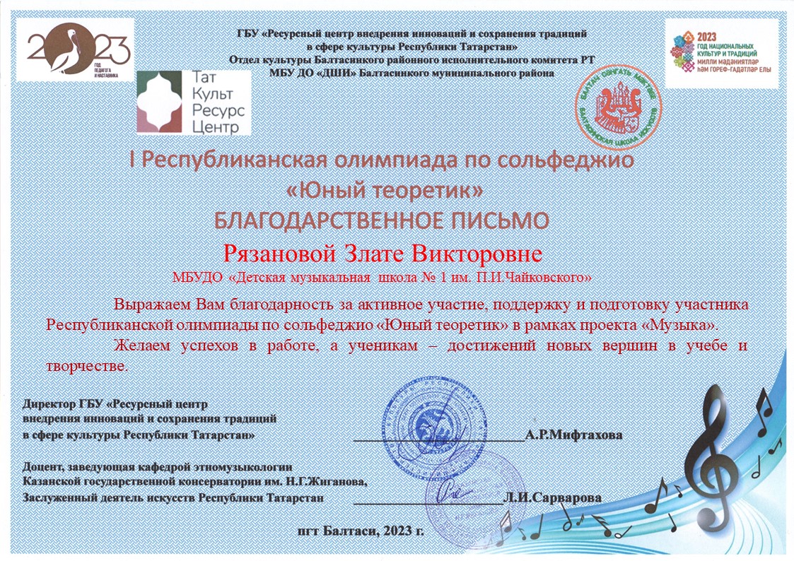 I Республиканская олимпиада по сольфеджио "Юный теоретик" - Благодарность Рязановой З.В.;