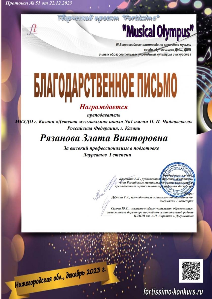 III Всероссийская олимпиада по слушанию музыки "Musical Olimpus" - Благодарность Рязановой З.В.;