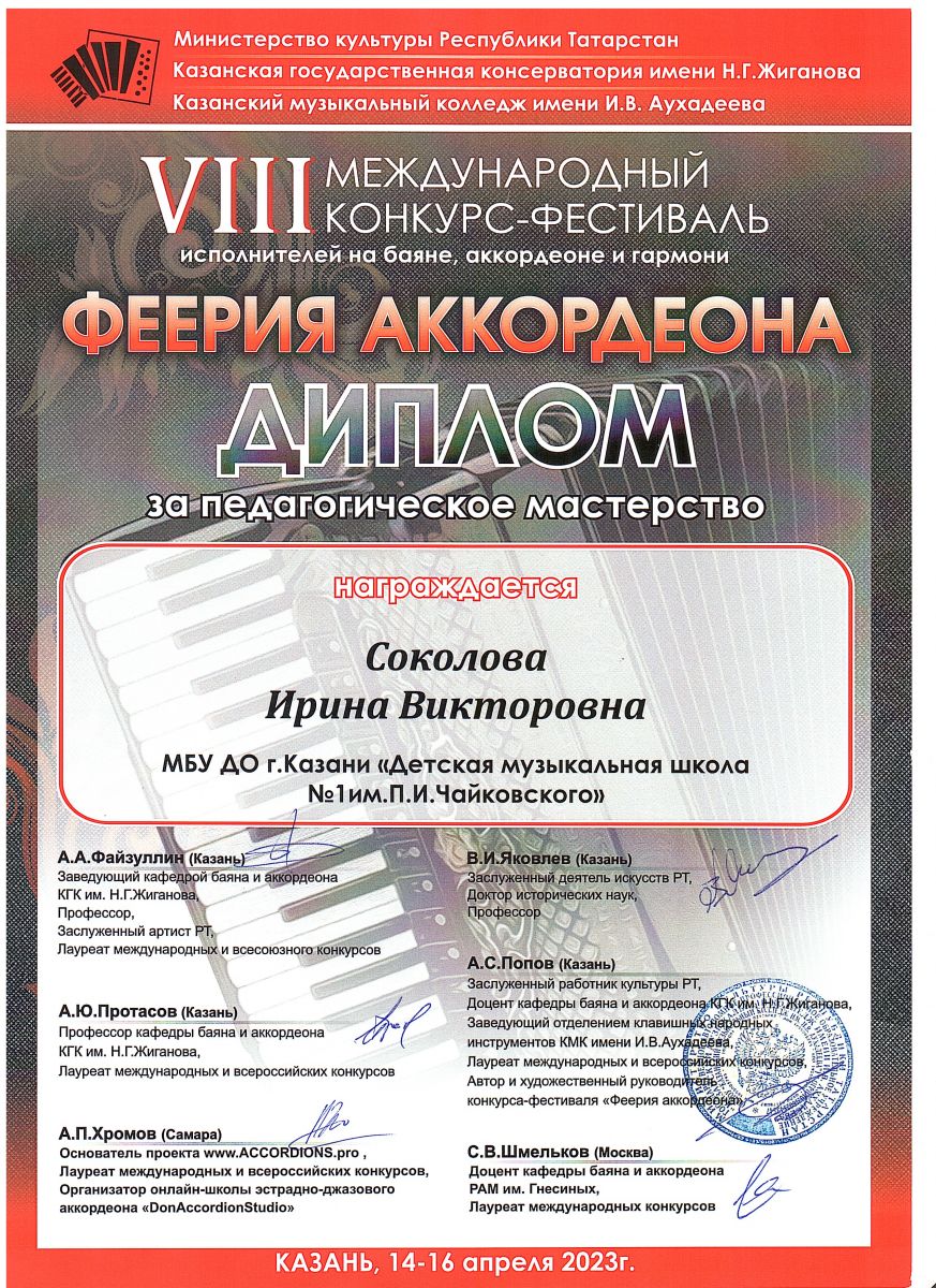 VIII Международный конкурс-фестиваль "Феерия аккордеона" - Благодарность Соколовой И.В.;