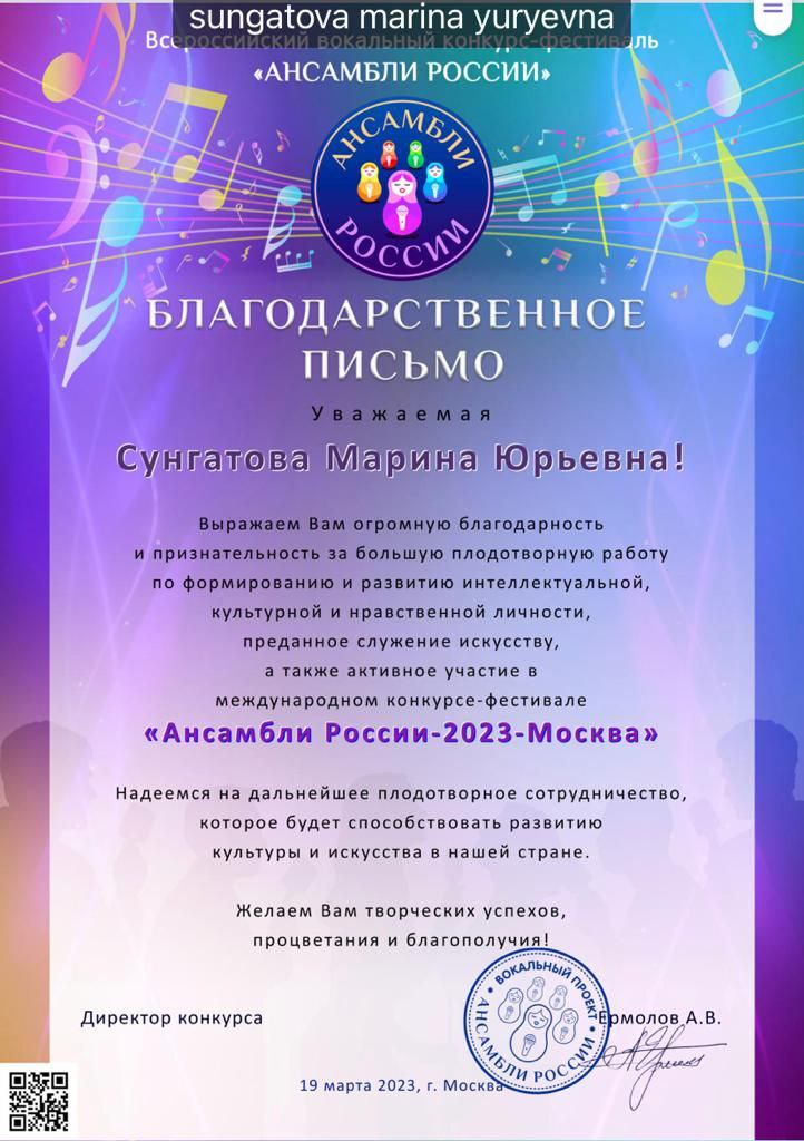 Всероссийский вокальный конкурс-фестиваль "Ансамбли России" - Благодарность Сунгатовой М.Ю.;