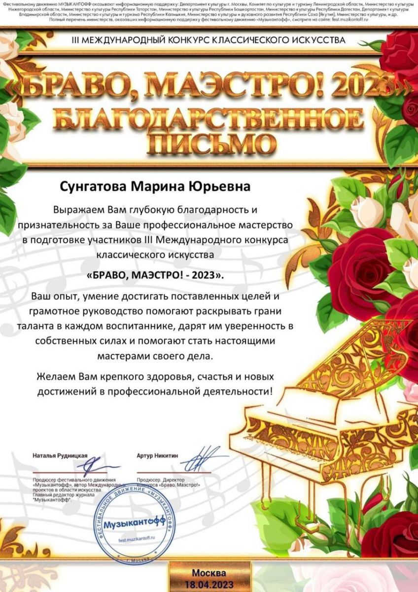 III Международный конкурс классического искусства "Браво, Маэстро" - Благодарность Сунгатовой М.Ю.;