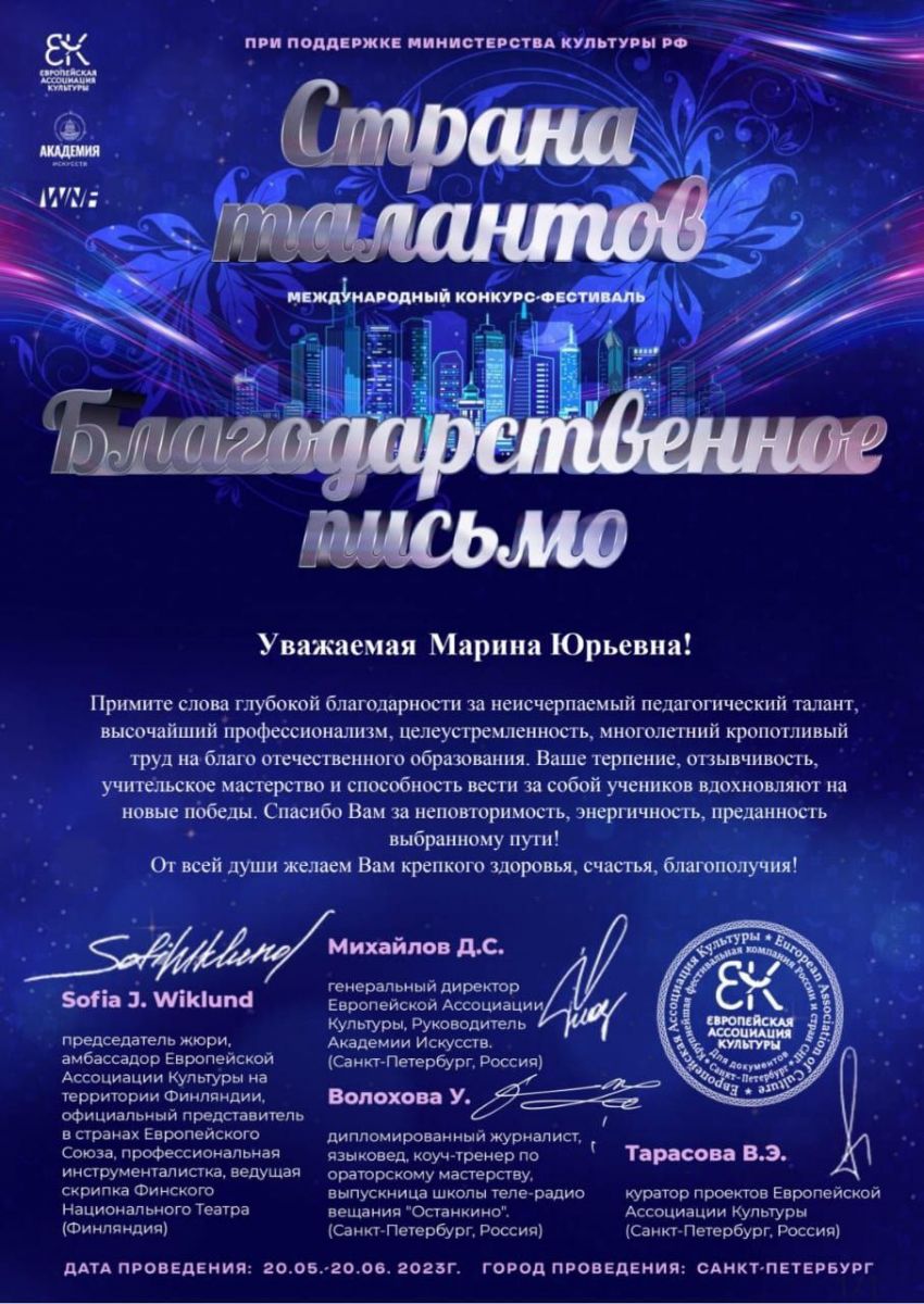 Международный конкурс-фестиваль "Страна талантов" -Благодарность Сунгатовой М.Ю.;
