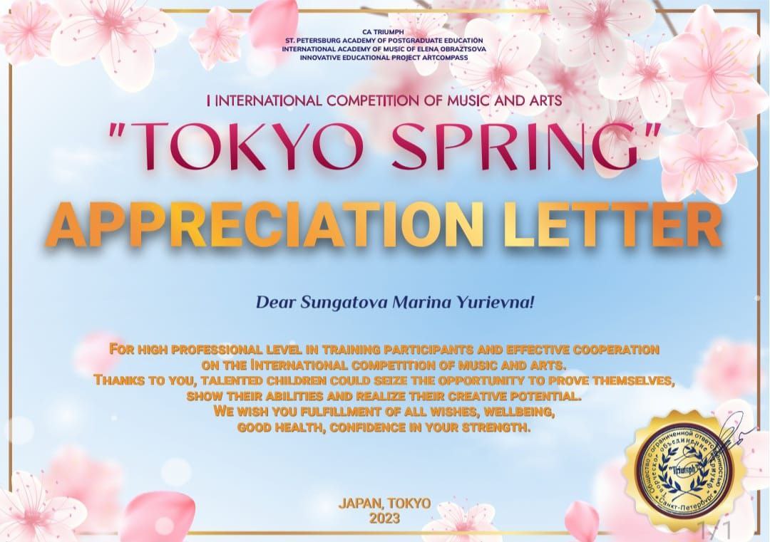 I Международный конкурс музыки и искусства "TOKYO SPRING" - Благодарность Сунгатовой М.Ю.;