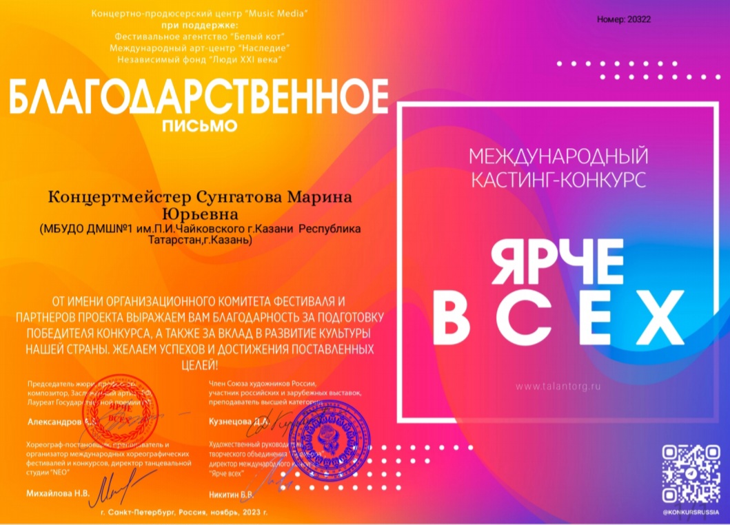 Международный кастинг-конкурс "Ярче всех" - Благодарность Сунгатовой М.Ю.;