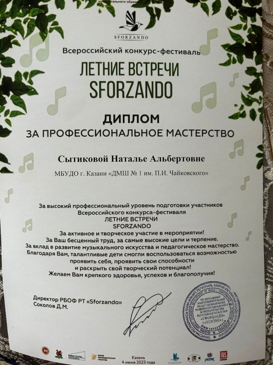 Всероссийский конкурс-фестиваль "Летние встречи SFORZANDO" - Благодарность Сытиковой Н.А.;