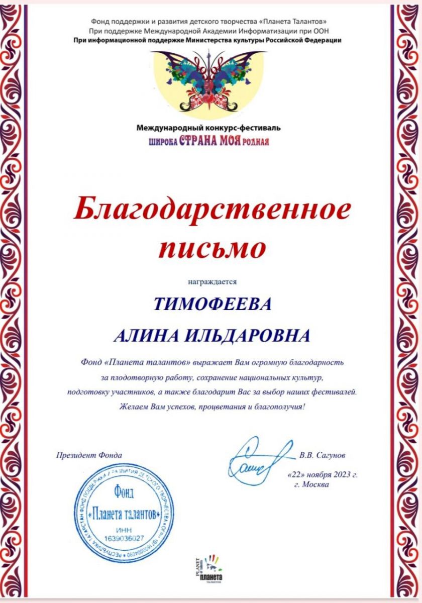 Международный конкурс-фестиваль "Широка страна моя родная" - Благодарность Тимофеевой А.И.;