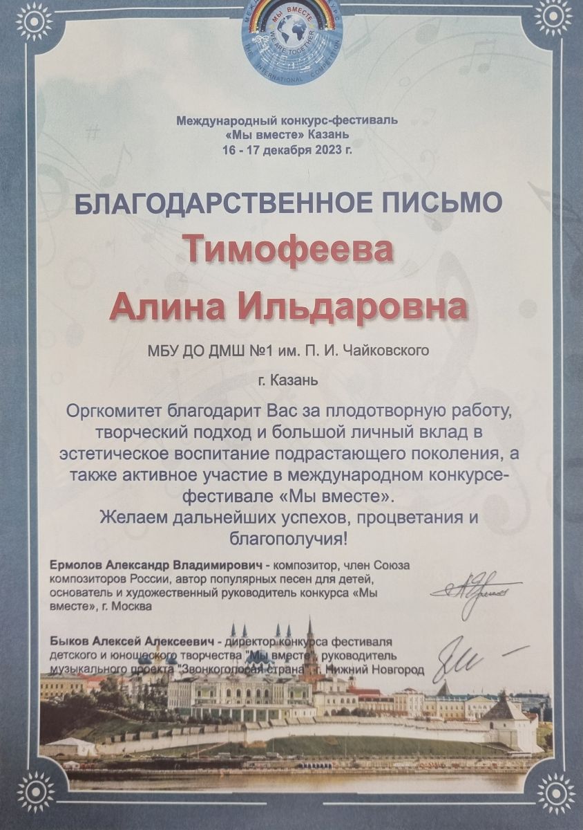 Международный конкурс-фестиваль "Мы вместе" - Благодарность Тимофеевой А.И.;