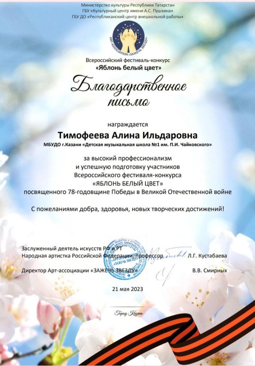 Всероссийский фестиваль-конкурс "Яблонь белый цвет" - Благодарность Тимофеевой А.И.;