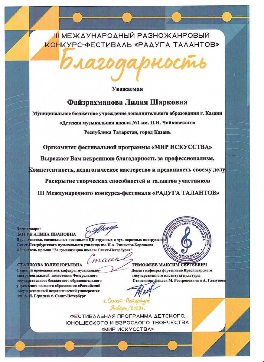 Международный конкурс искусств "Радуга талантов" - Благодарность Файзрахмановой Л.Ш.;