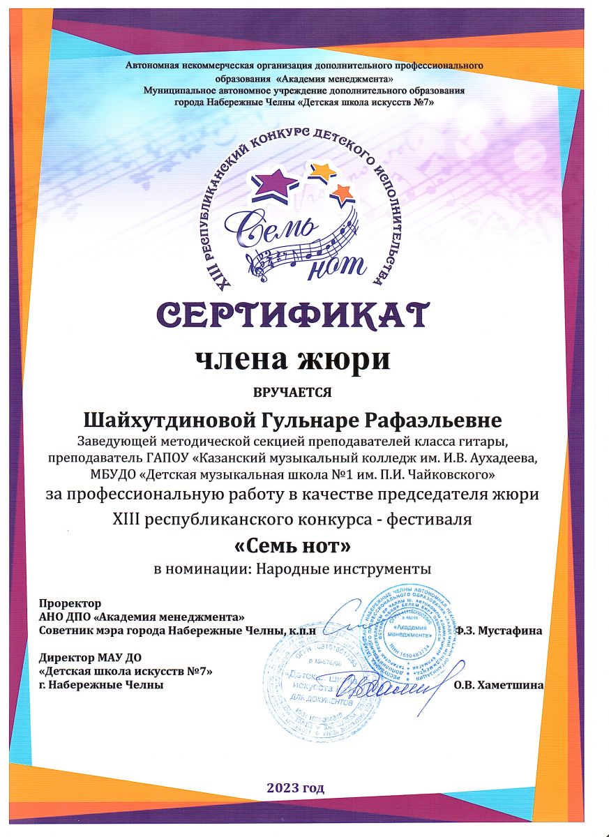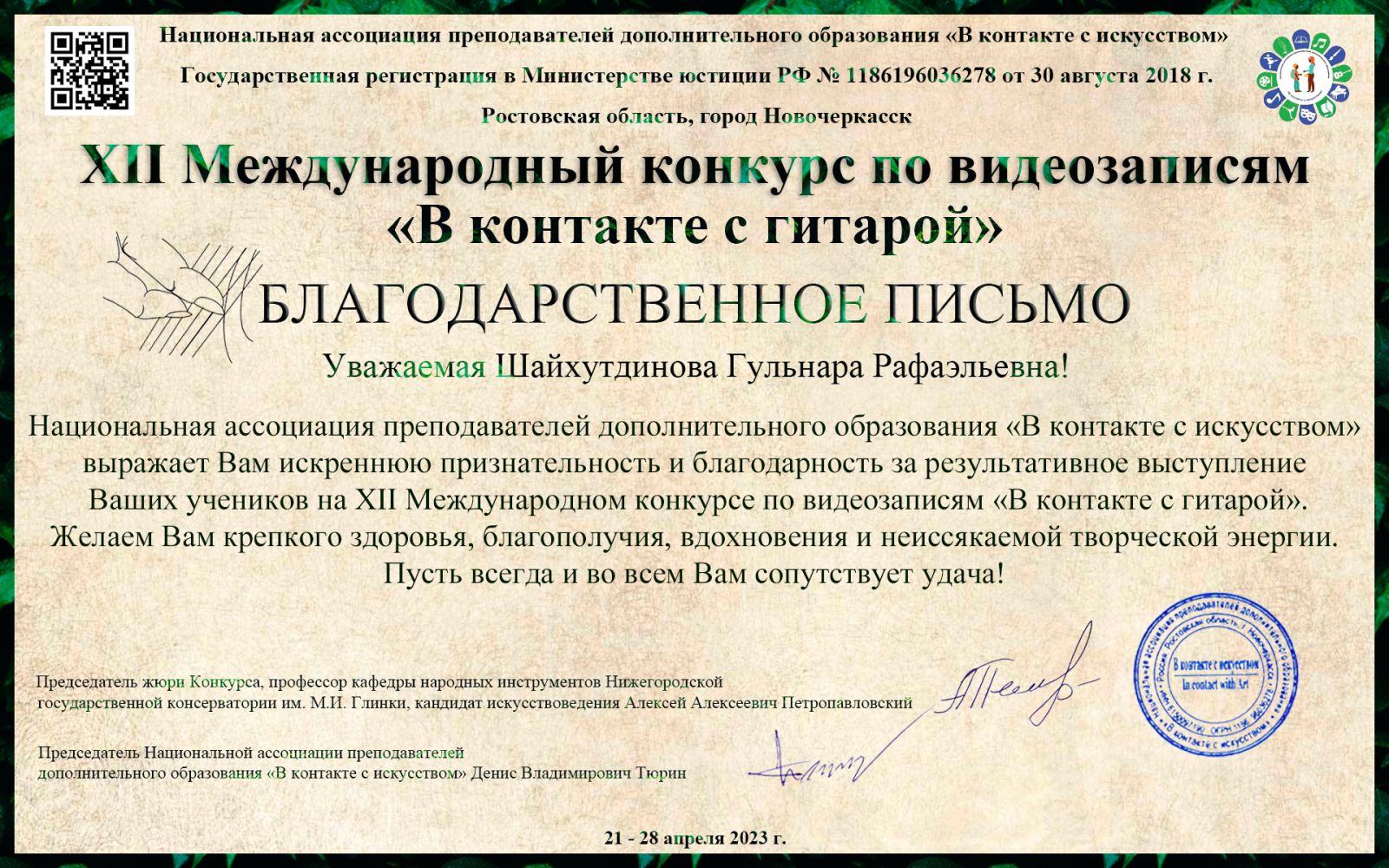 ХII Международный конку по видеозаписям "В контакте с гитарой" - Благодарность Шайхутдиновой Г.Р.;