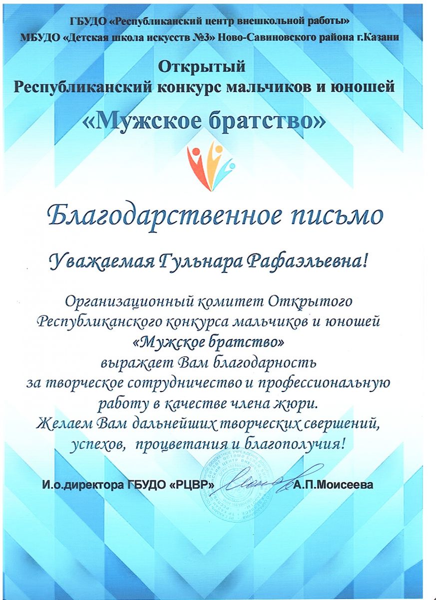 Республиканский конкурс мальчиков и юношей "Мужское братство" - Благодарность Гиниятуллиной Л.А.