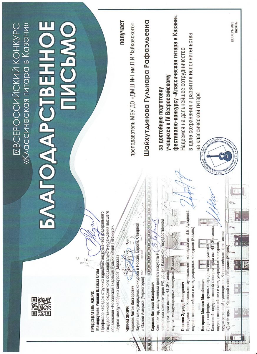 IV Всероссийский конкурс "Классическая гитара в Казани" - Благодарность Шайхутдиновой Г.Р.;