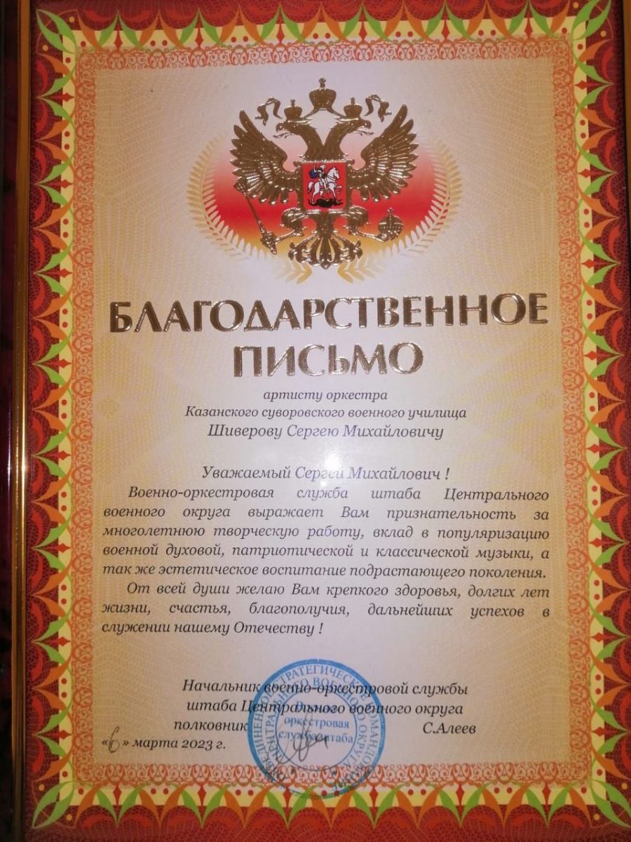 Военно-оркестровая служба штаба ЦВО - Благодарность Шиверову С.М.;