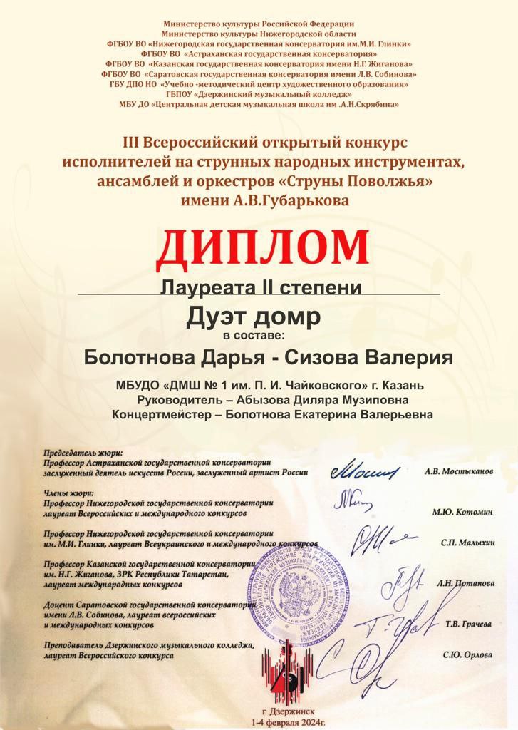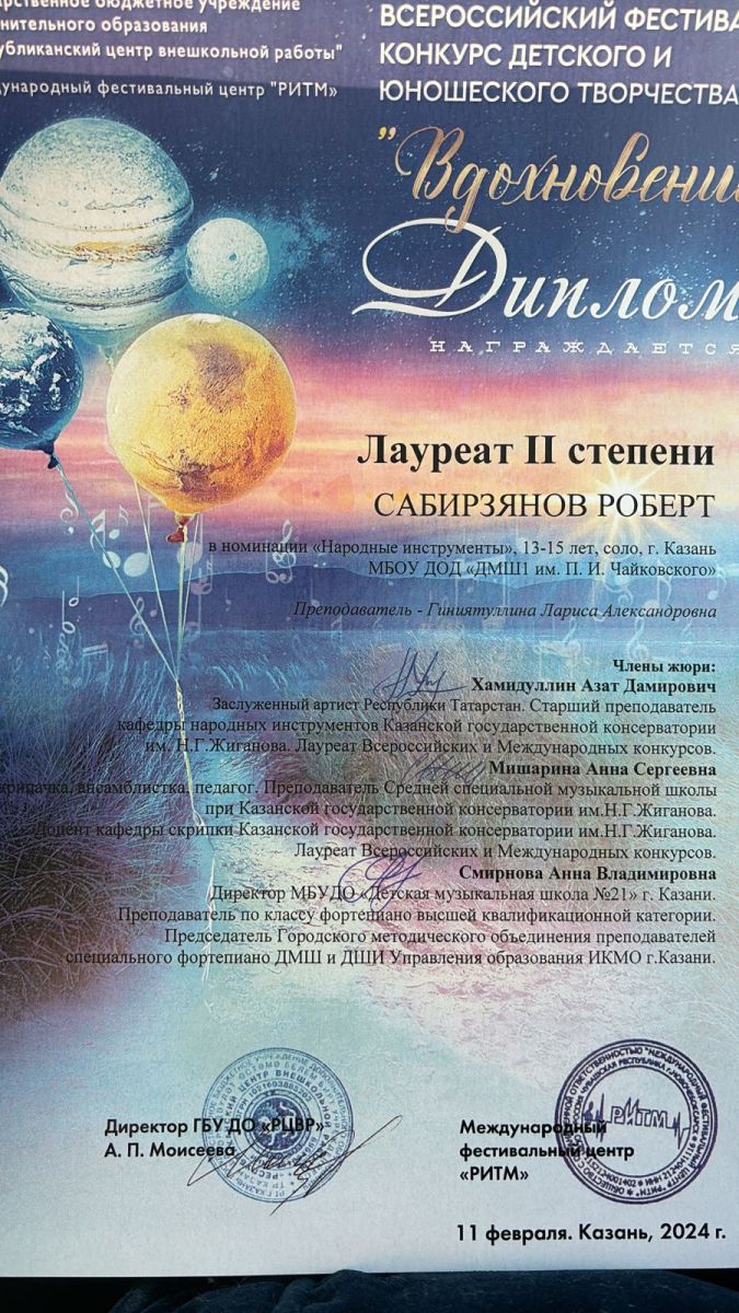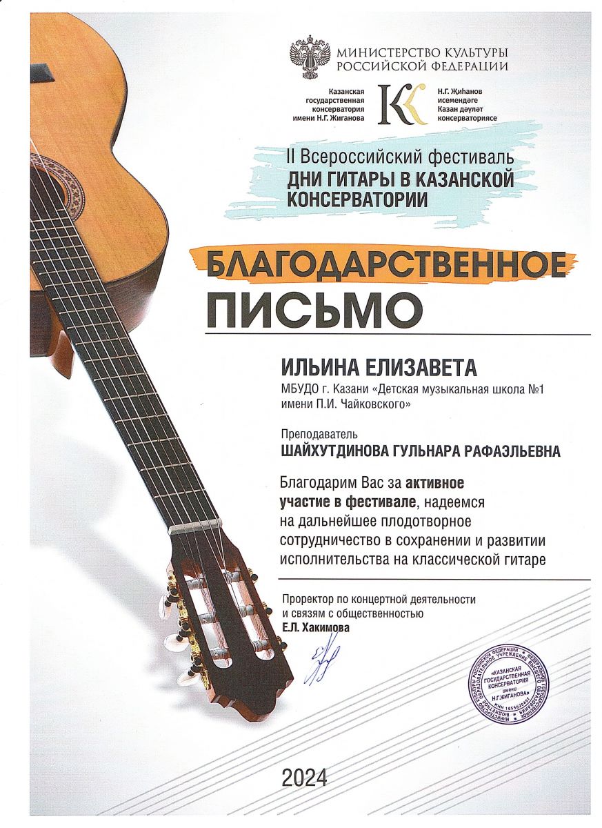 II Всероссийский фестиваль "Дни гитары в Казанской консерватории" - Благодарственное письмо Николаеву Илье, класс Петрухиной И.А.;