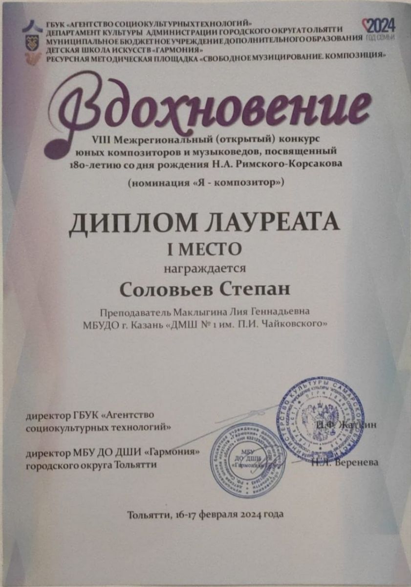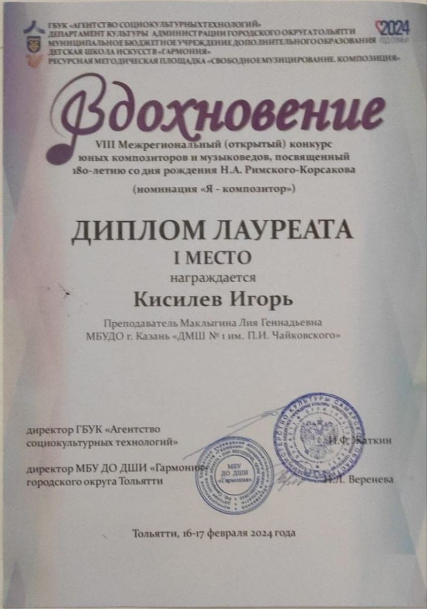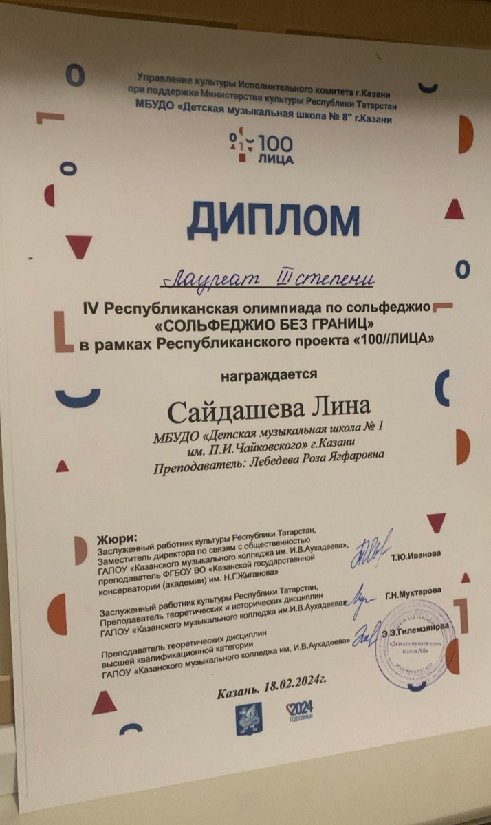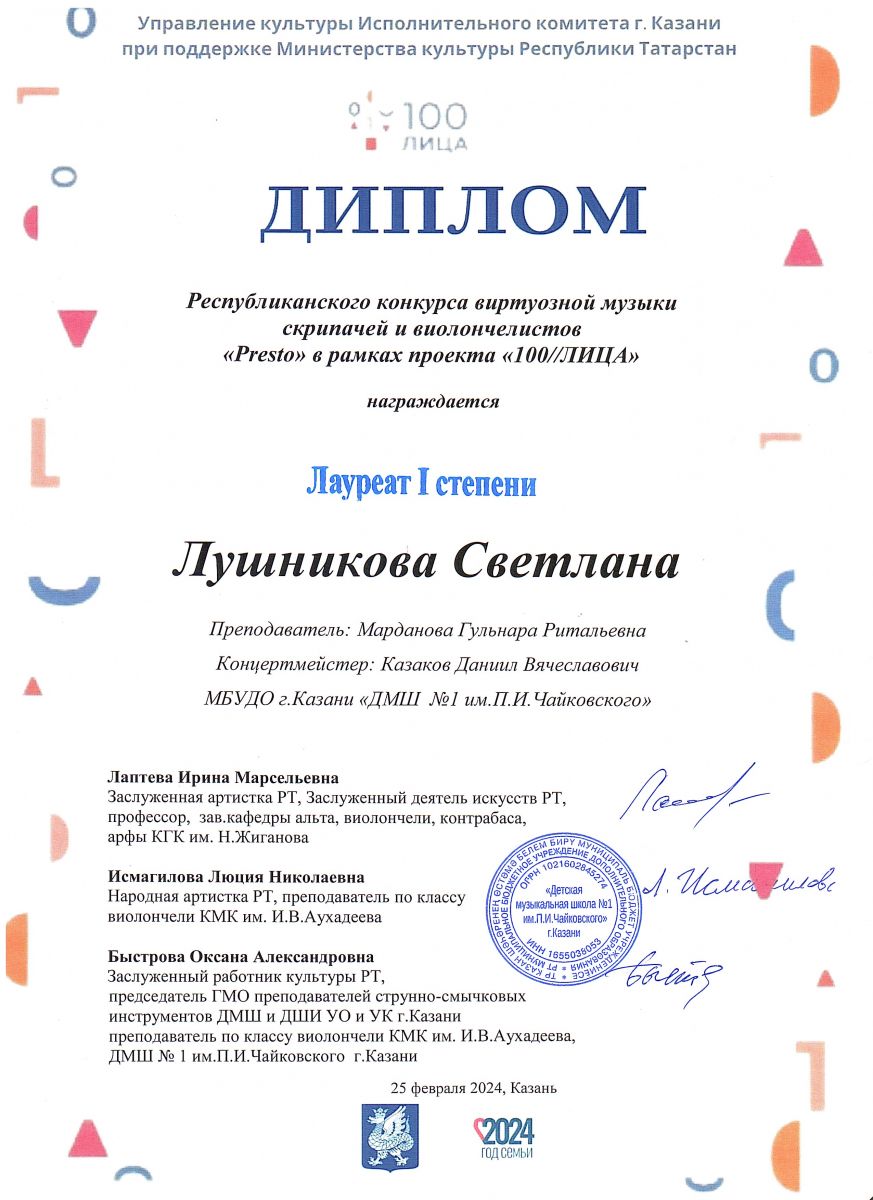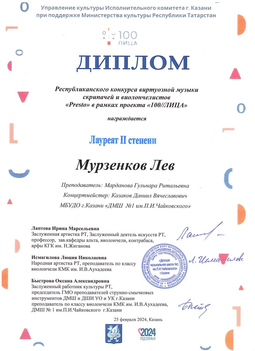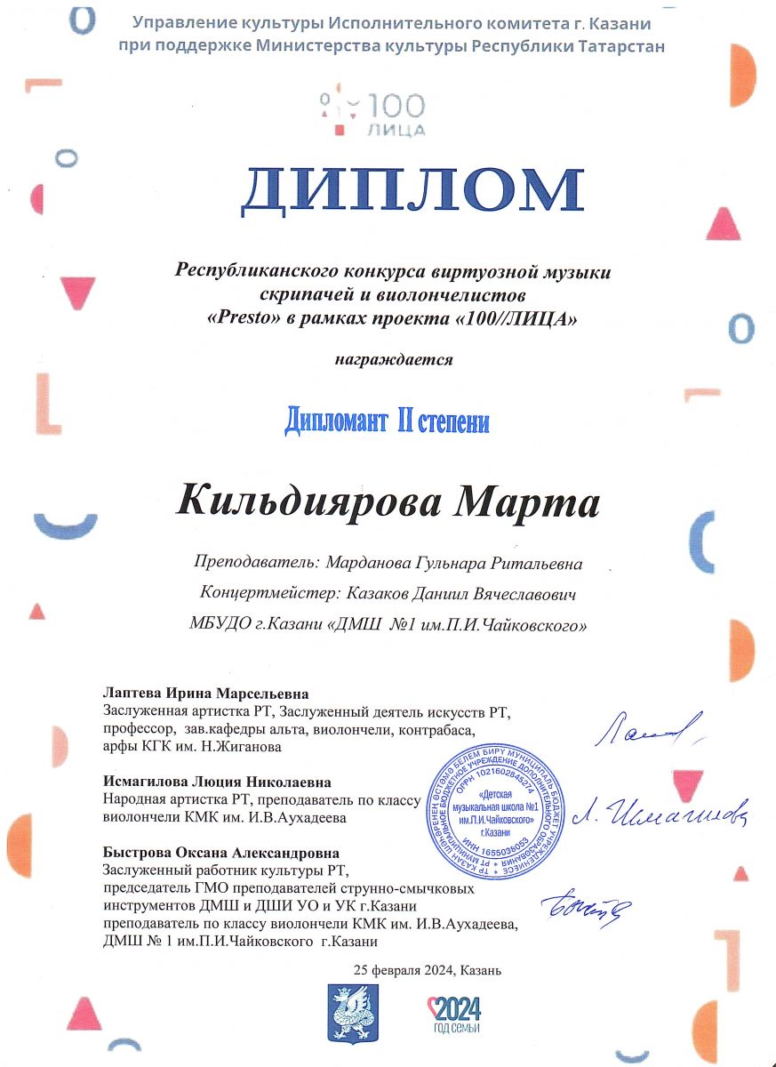 Республиканский конкурс виртуозной музыки скрипачей и виолончелистов "Presto" в рамках проекта 100//ЛИЦА - Лауреат степени, класс, концертмейстер;