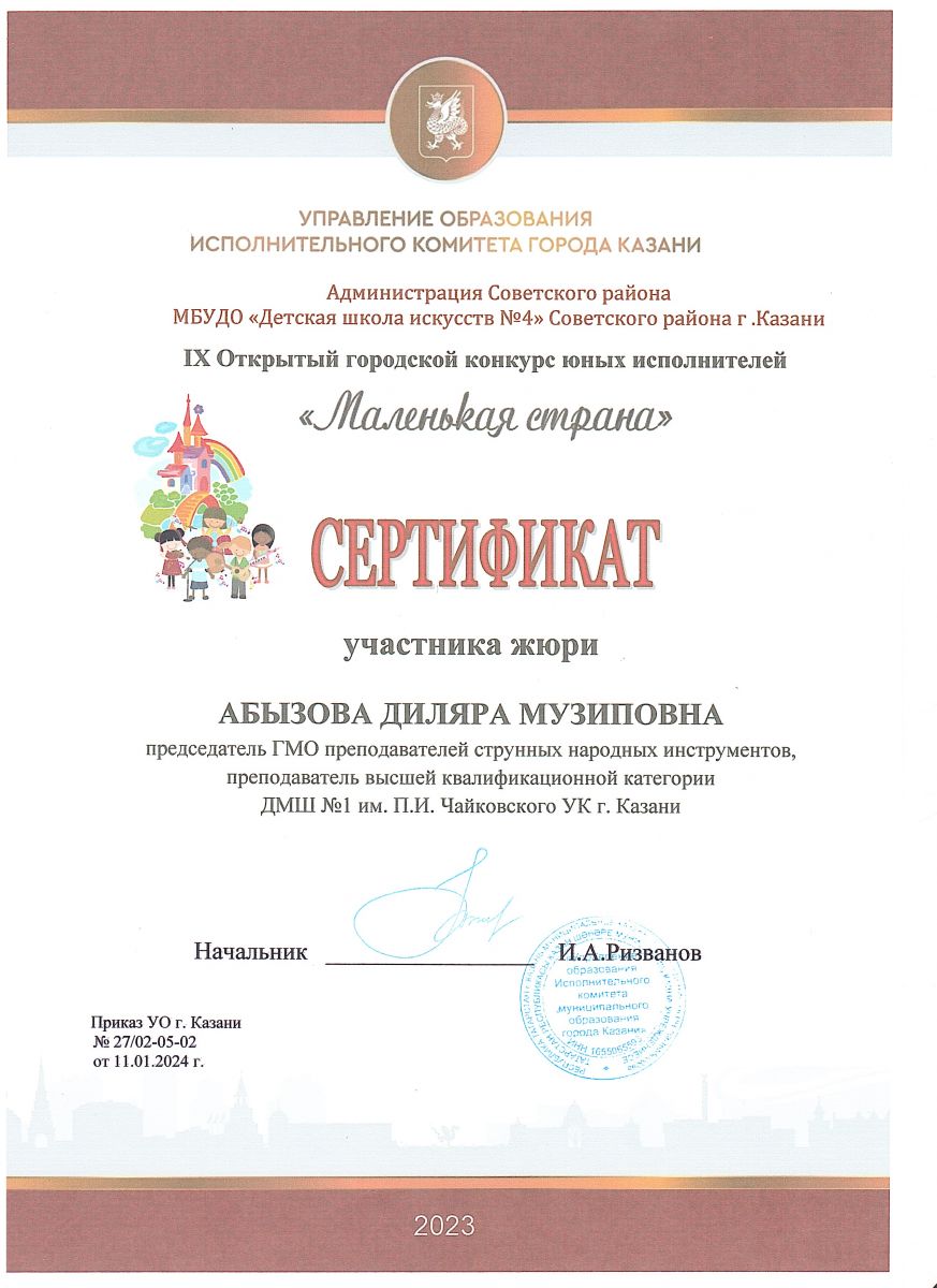 Шайхутдинова Г.Р. - сертификат участника жюри IX Открытого городского конкурса юных исполнителей "Маленькая страна";