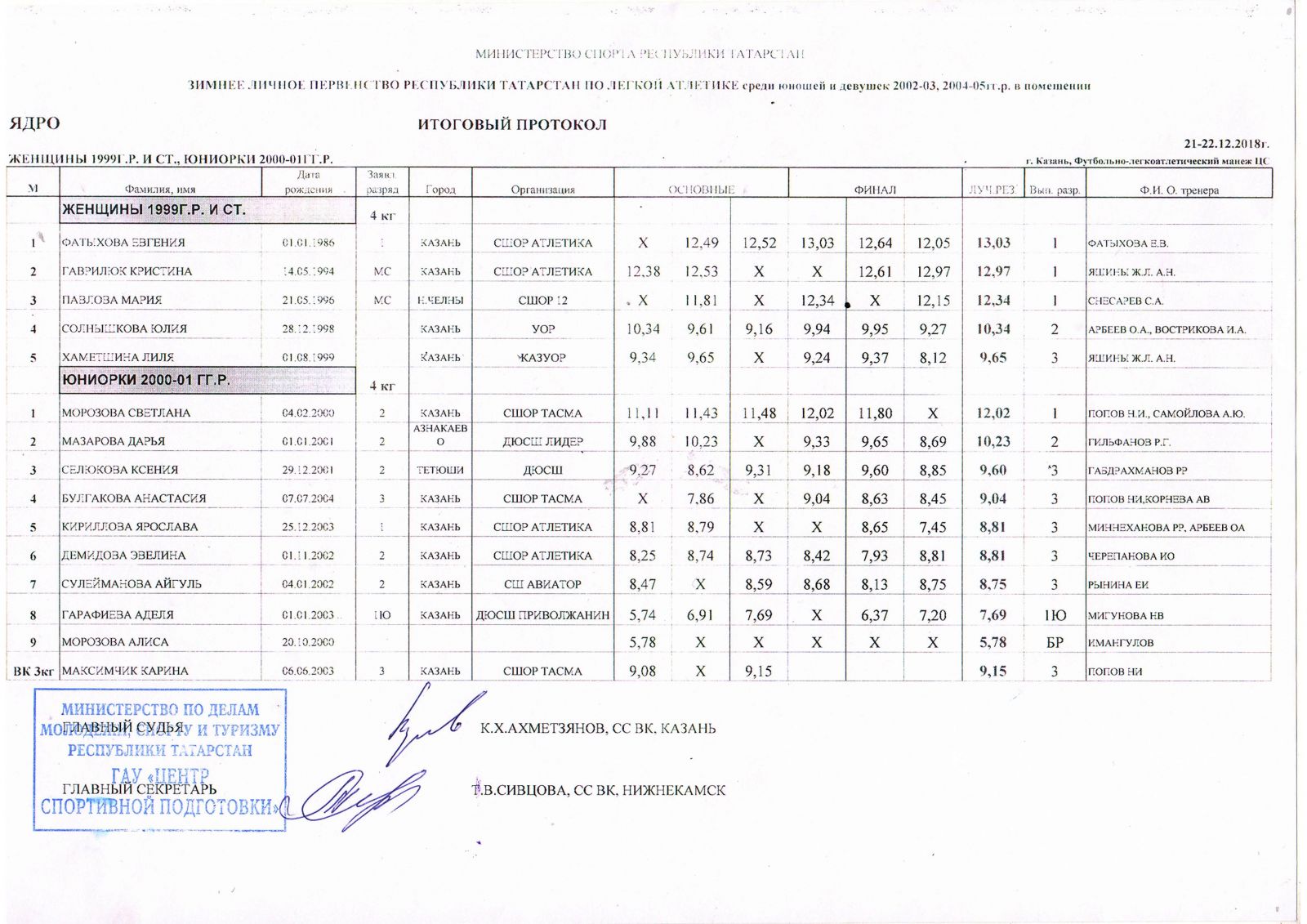 Чемпионат и Первенство РТ среди юниоров 2000-2001г.р., 21-22 декабря 2018г., г.Казань