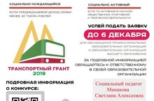 Республиканский конкурс «Транспортный грант» в этом году возвращается с большими и приятными изменениями: финансирование возросло с 30 до 60 млн рублей. Для получения компенсации на транспортные расходы необходимо подать заявление ответственному в своей образовательной организации. (Манаковой Светлане Алексеевне 25 кабинете).