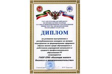 ГАУЗ "Республиканский центр медицинской профилактики" награждает ГАОУ СПО "Колледж малого бизнеса и предпринимтельства" за успешное выступление в республиканском конкурсе на лучшее мероприятие по формированию здорового образа жизни среди обучающихся и работников учебных заведений начального и среднего профессионального образования РТ.