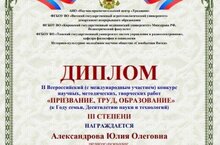Поздравляем педагога-психолога Александрову Ю.О. за победу во II Всероссийском конкурсе "Призвание, труд, образование" за работу ""Учебная программа: релаксационные занятия в кабинете психологической разгрузки как организация безопасной среды в КЭК" и получение диплома 3 степени.