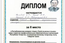 Наши студенты - Багабиев Карим Радикович, Гареев Фред Фоатович, Идрисов Ислам Инсафович, Фархутдинов Булат Ильясович (руководители – Гафиятуллина Энже Хабибулловна, Попова Евгения Леонидовна) участвовали в направление "Стихотворения на русском языке" и получили диплом 2 степени.