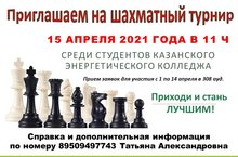 Приглашаем всех студентов Казанского энергетического колледжа принять участие в Турнире по шахматам, который состоится 15 апреля 2021 года, в 302 аудитории в 11 часов. Шахматы - поистине, гениальная игра, в которой вам потребуется логика, умение выстраивать стратегию, предугадывать последующие ходы соперника. Данная игра – замечательный способ развития интеллектуальный способностей независимо от возраста.