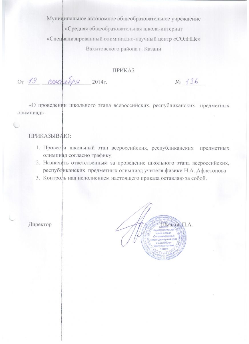 Приказ МОиН РТ по школьному этапу Всероссийской олимпиады школьников в 2015-2016 учебном году