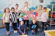 На уроках ИЗО ученики школы прогресс 1-5 классов подготовили поздравительную стенгазету. Каждый сделал праздничную открытку и все они были объединены в общий коллаж. В соих работах ребята использовали символы 9 мая- георгиевская лента, танки ,гвоздики. Работы выполнялись в разных техниках- живопись, аппликация, коллаж.