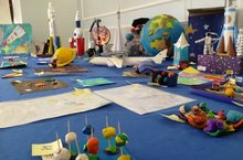 Кто-то из учащихся приготовил несколько работ, кто-то готовил одну коллективную поделку от всего класса. Здесь были представлены и космические корабли, и космонавты ,и парады планет. Были и небольшие рисунки и масштабные работы - целый земной шар!