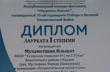 Укучыларыбыз гимназиядәге генә түгел, ә район, республика, Россия күләмендә булган конкурс, бәйгеләрдә дә катнаша. Шундый укучыларыбызның берсе – Мухаметшин Ильшат. Ул Бөек Ватан Сугышындагы Җиңүнең 75 еллыгына багышланган “Россия патриотлары!” дип исемләнгән республика конкурс-фестивалендә катнашты һәм 1 нче дәрәҗәдәге лауреат белән бүләкләнде. Җитәкчесе Мустафина Фәридә Шамилевна белән берлектә алар “Патриотик җыр-Соло” номинациясенә Ильшатның видеочыгышын җибәргән булганнар. Әлеге талантлы укучыбызга алга таба да уңышлар гына телибез!