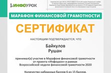24 нче октябрьдән 31 нче октябрьгә кадәр Бөтенроссия финанс грамотлылыгы атналыгы билгеләнгән. Ул онлайн форматта уза. Бүген бездә дә барлык сыйныфлар бу чарада катнаштылар. Кайбер сыйныфлар онлайн-квест, ә кайберләре аерым тест рәвешендә үзләренең белемнәрен сынадылар. Нәтиҗәдә барысы да сертификат, дипломнар белән бүләкләнде.