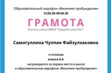 Поздравляем учителя русского языка и литературы Самигуллину Чулпан Файзулхаковну и команду 6А класса, занявшим первое место в образовательном марафоне "Весеннее пробуждение".