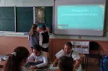 В рамках внеурочной деятельности через объединения по интересам "Искусство и литература татарского народа" проведено занятие в 5а классе по теме: "Татарский национальный костюм". Руководитель: Сабирзянова Р.И.