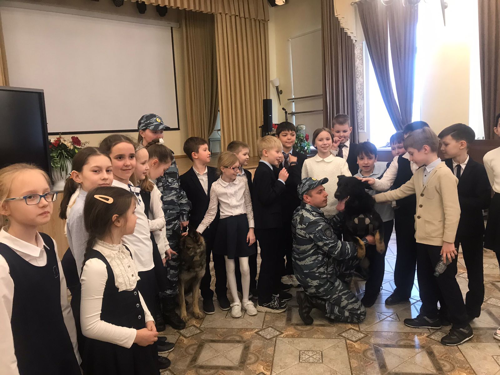Опубликовано: 25.04.202225 апреля, в рамках гражданско-патриотического воспитания, профориентационного месячника и недели "Зоозаботы", обучающие второй смены: 3а, 3б, 6б, 7б, 8а, 8б встретились с ветеранами Совета ветеранов ФСБ РТ Берюля Владимиром Леонидовичем и Кондаковом Василием Владимировичем, а также ребята наблюдали за работой сотрудников и и собак кинологической службы РТ.