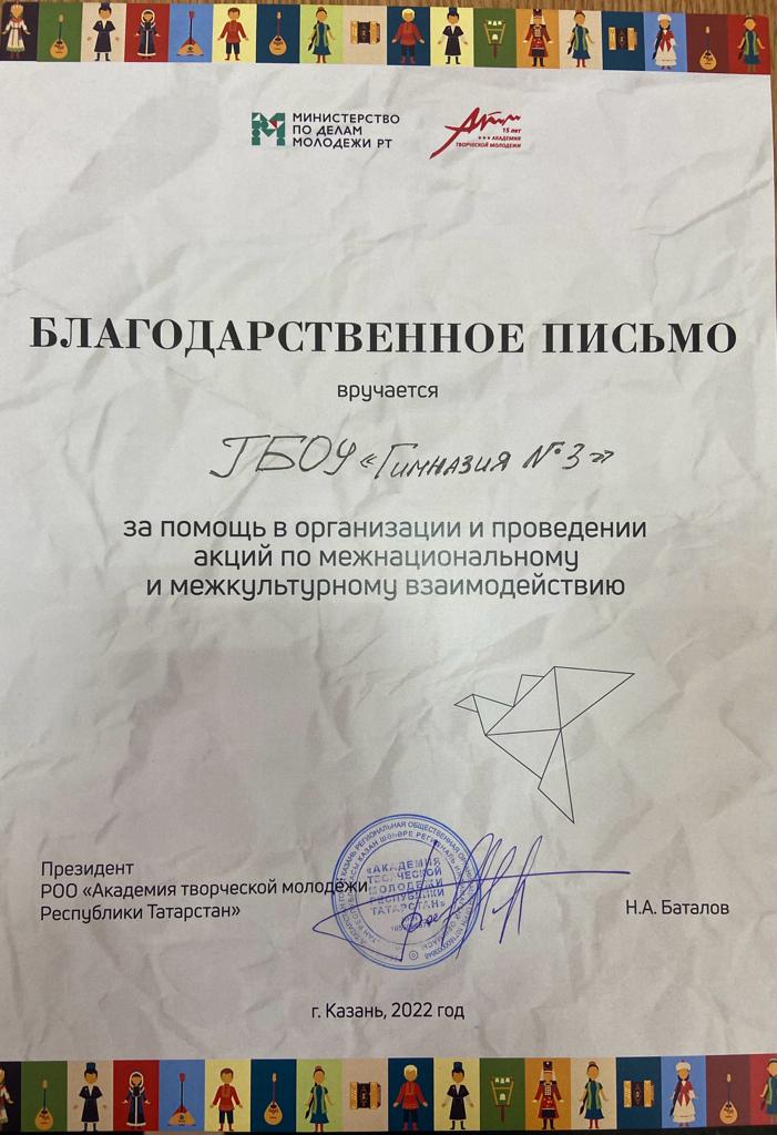 Опубликовано: 22.10.2022Министерством по делам молодёжи в лице президента РОО "Академия творческой молодёжи РТ" было вручено благодарственное письмо нашей гимназии за помощь в организации и проведении акций по межнациональному м межкультурному взаимодействию.