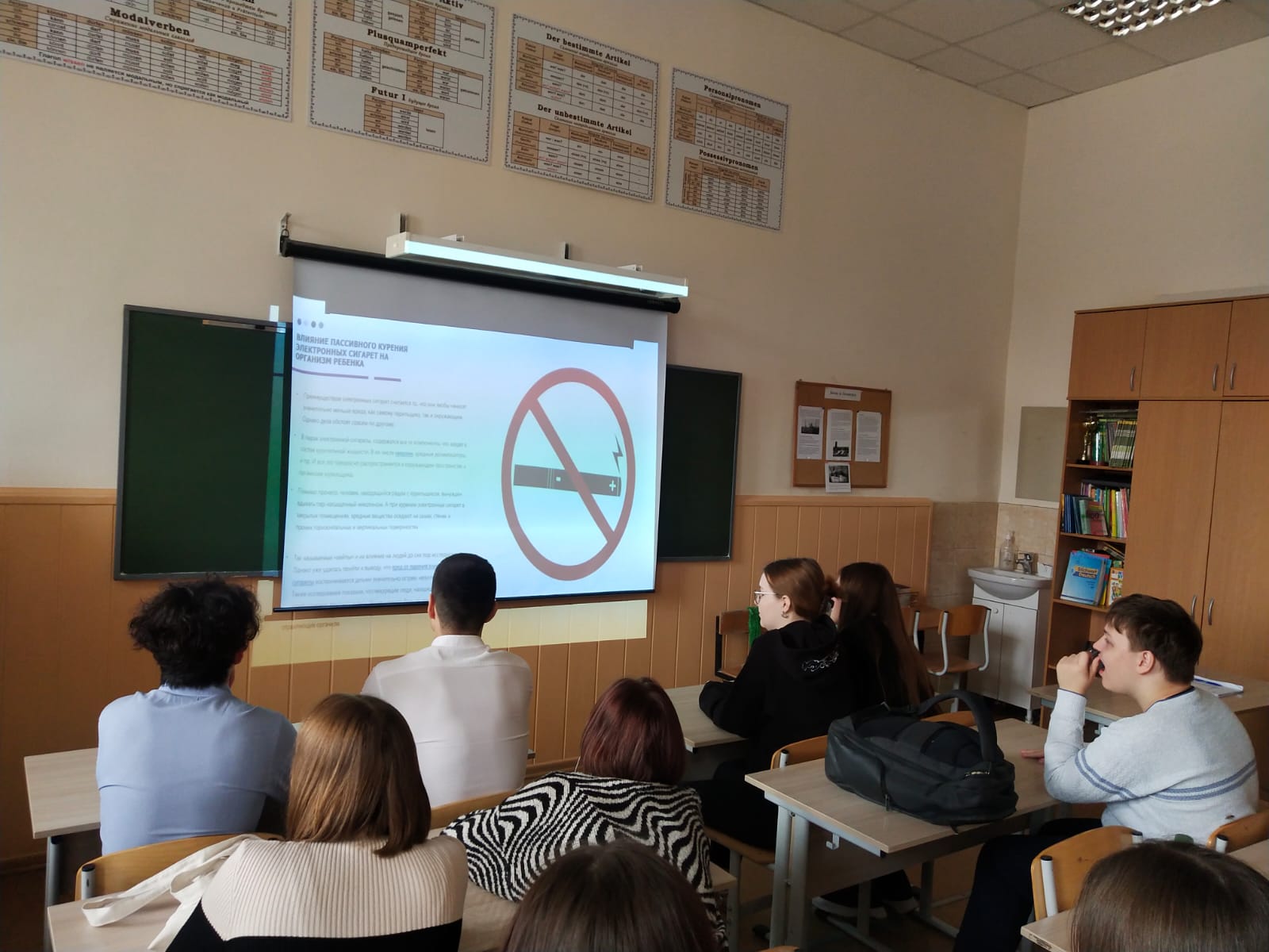 Опубликовано: 20.03.2023Классный час в рамках месячника асоциальных явлений " Влияние пассивного курения электронных сигарет на организм человека " 10 "А" класса.