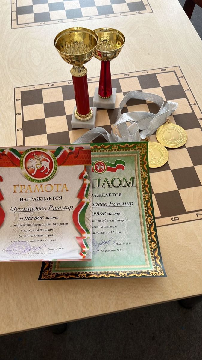 Опубликовано: 11.05.2023Мухамадеев Ратмир, ученик 3 "В" класса, занял два первых места в Первенстве Республики Татарстан по Русским шашкам