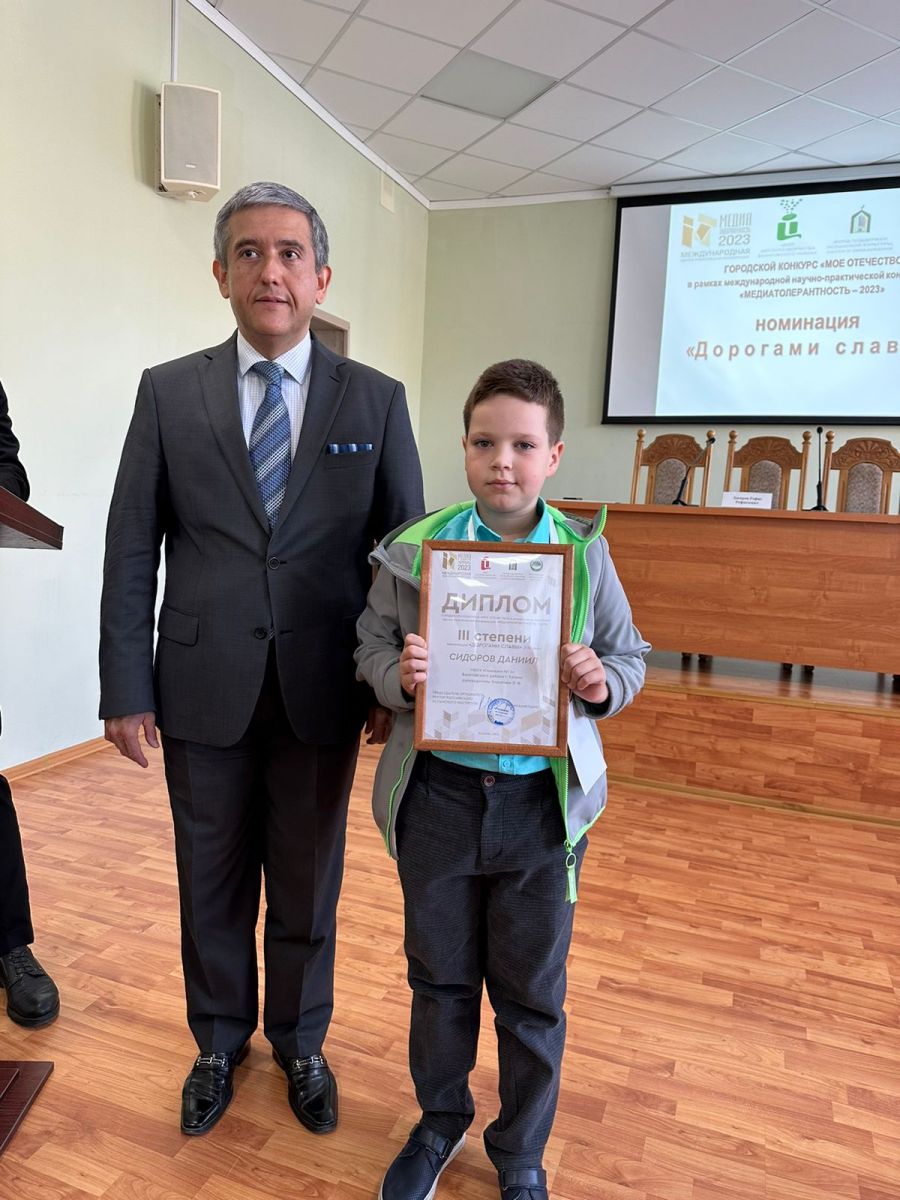 Опубликовано: 02.10.2023Сидоров Даниил 1а класс призер городского конкурса «Мое Отечество» в рамках международной научно-практической конференции «Медиатолерантность-2023»