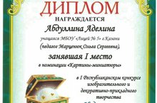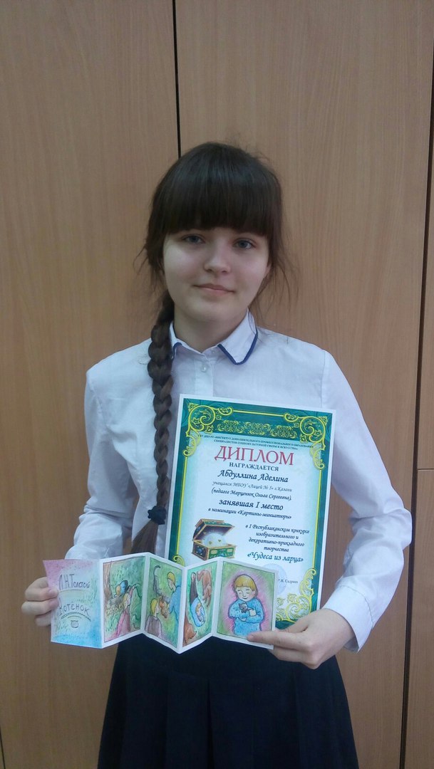 Ученица нашего лицея Абдуллина Аделина (10 Б кл.) приняла участие в I Республиканском конкурсе изобразительного и декоративно-прикладного творчества «Чудеса из ларца».