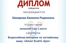 Поздравляем учащихся 10 «А» класса Сафина Камиля и Шакирову Камиллу, занявших 3 место во Всероссийской викторине по английскому языку «School Erudite Quiz».Желаем дальнейших успехов в изучении английского языка!