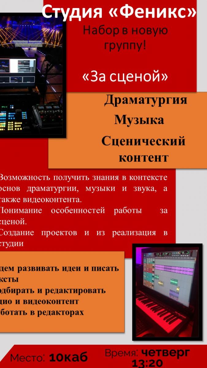 Творческая студия «Феникс» объявляет дополнительный набор в актерские группы : средняя (4-5 класс) занятия в пятницу в 13.20 , субботу в 11.30 и старшую (9-11 класс) занятия по средам и субботам в 13.20. А также набор в новую группу «За сценой» ( свет, звук , сценарий ) занятие в четверг в 13.20 — первый сбор 21 сентября.
