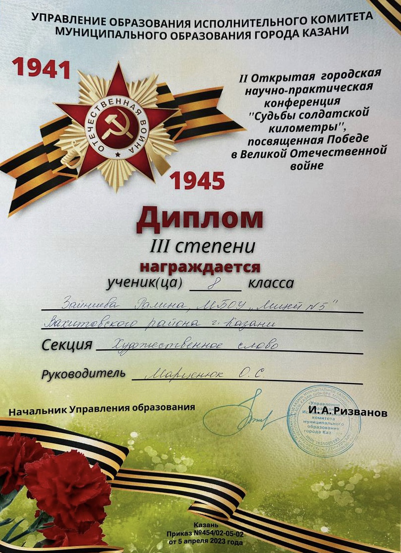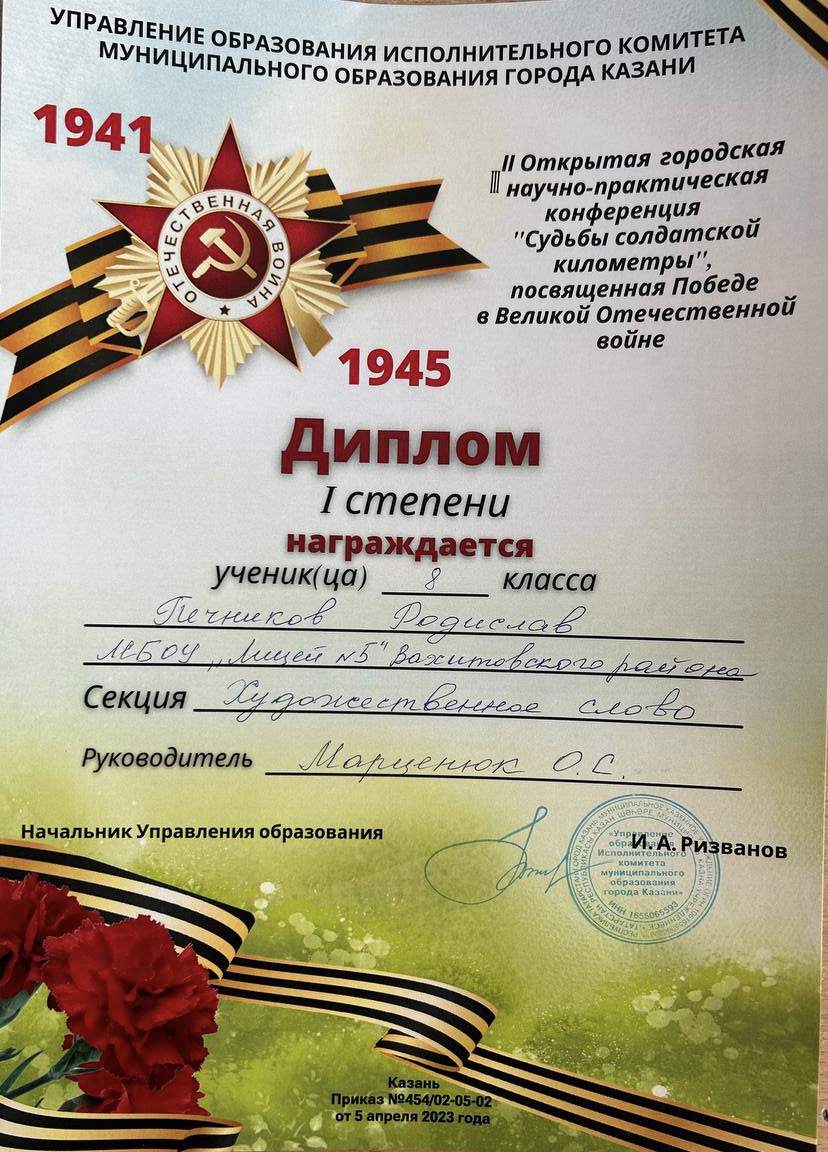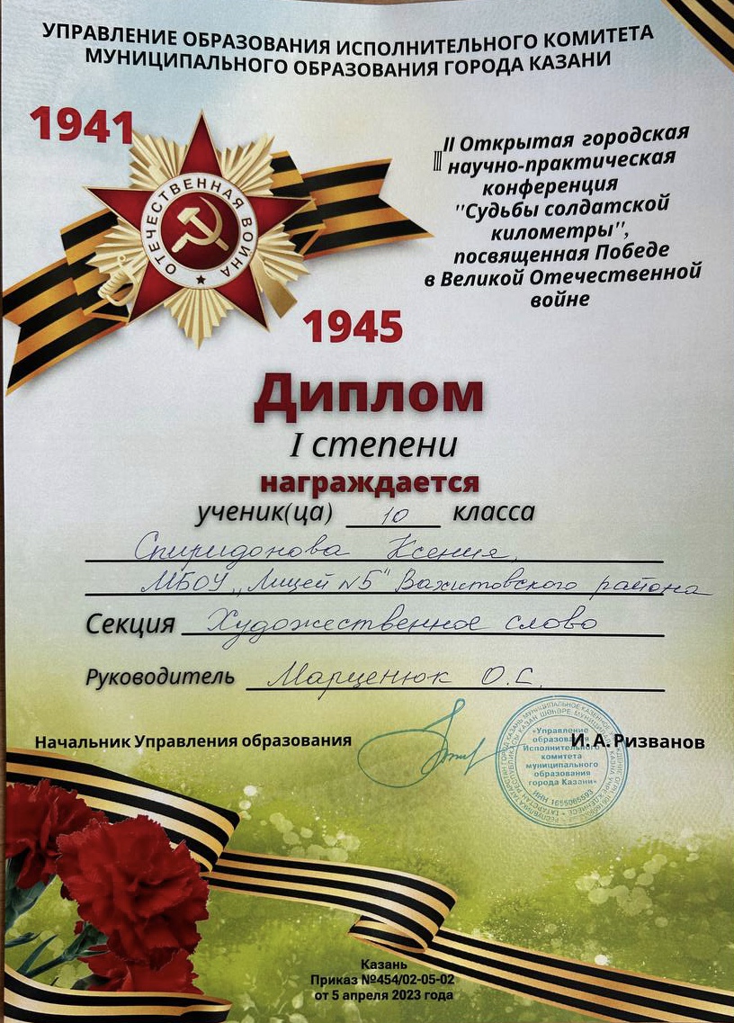 Лицей №5 забрал все призовые места под руководством учителя русского языка и литературы Марценюк Ольги Сергеевны. 3 место- Зайниева Ралина (8в класс), 2 место - Воробьёва София (8б класс), 1 место - Печников Радислав (8а класс), 1 место - Спиридонова Ксения (10а класс).